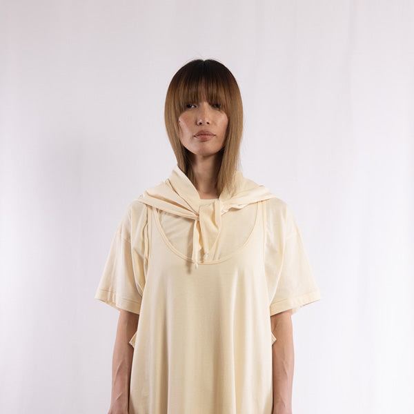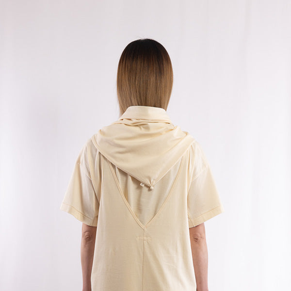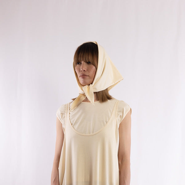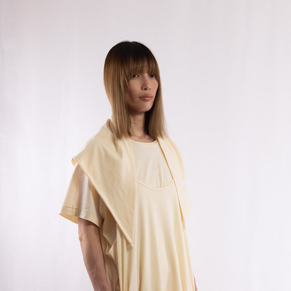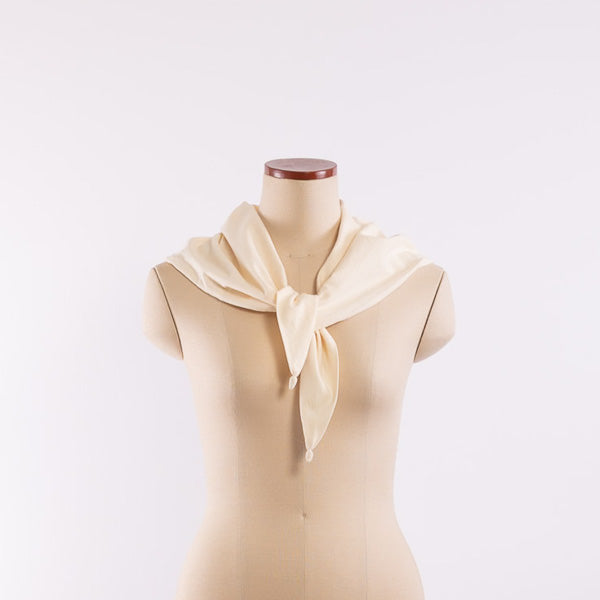 Detail      This material is exceptionally lightweight and soft, and by knitting it at a finer gauge than usual, it achieves a sheer-resistant, elegant finish despite its thinness. It pairs well with items No. 250101, 250102, and 250103, and can be used as a subtle accent to a simple outfit or as protection from the sun. Each of the three corners features a handcrafted detail—gathered with leftover baby alpaca yarn from winter knit caps—adding a touch of warmth and artisanal charm.