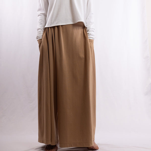 Detail      These are full-length wide-leg pants designed with a skirt-like silhouette, featuring a generously gathered waist. The waistband is elasticated, allowing you to adjust and style the gathers in various ways. For added convenience, tabs are sewn into the inner sides of the hem and can be buttoned to the inner sides of the waistband. This clever design prevents the hems from touching the floor when using the restroom. A drawstring is threaded through both the front and back of the waistband, so you can easily put the pants on or take them off by loosening just one side. There are pockets on both sides. The only difference between size 2 and size 3 is the length: Size 2 (M): 89 cm Size 3 (L): 95 cm