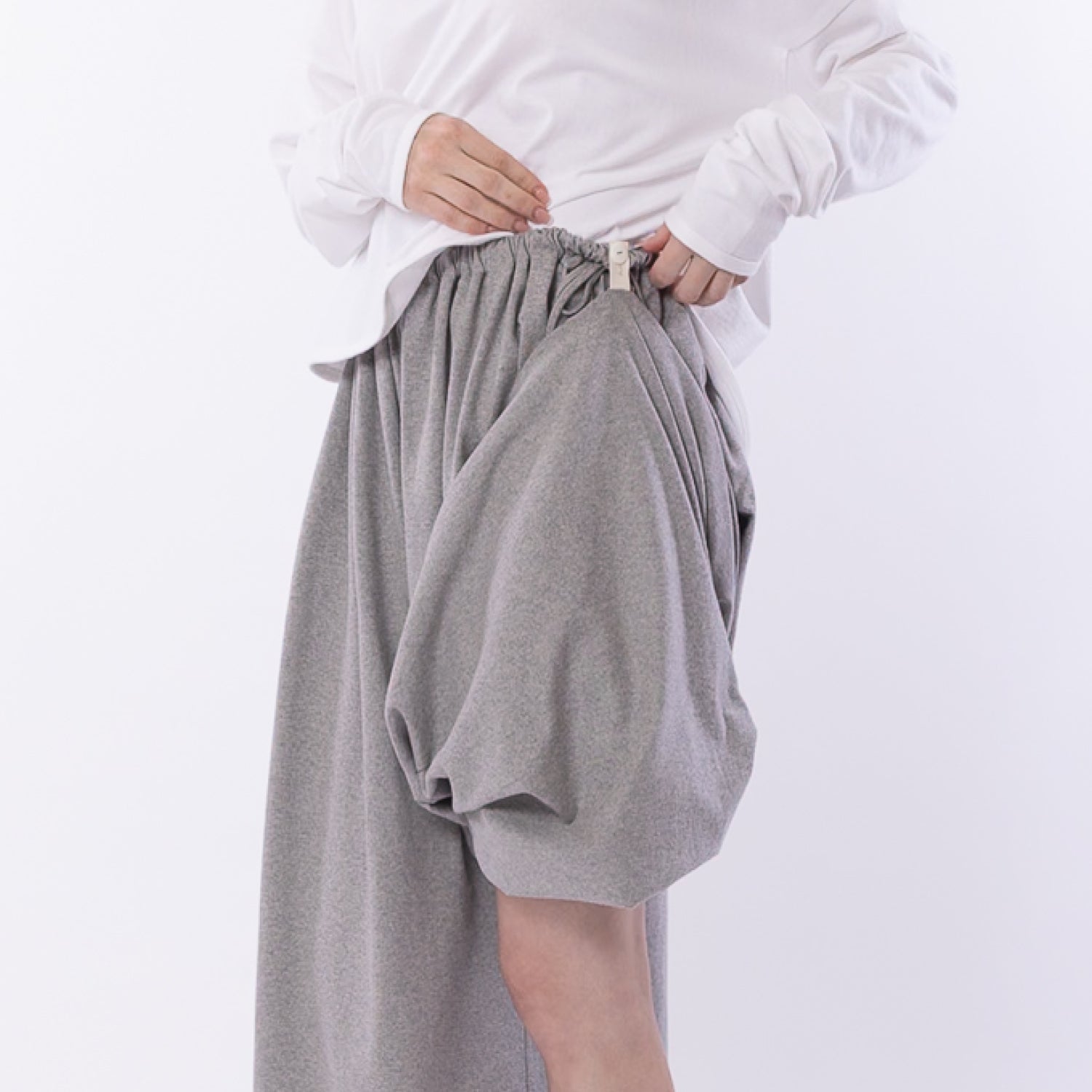 Detail      These are full-length wide-leg pants designed with a skirt-like silhouette, featuring a generously gathered waist. The waistband is elasticated, allowing you to adjust and style the gathers in various ways. For added convenience, tabs are sewn into the inner sides of the hem and can be buttoned to the inner sides of the waistband. This clever design prevents the hems from touching the floor when using the restroom. A drawstring is threaded through both the front and back of the waistband, so you can easily put the pants on or take them off by loosening just one side. There are pockets on both sides. The only difference between size 2 and size 3 is the length: Size 2 (M): 89 cm Size 3 (L): 95 cm